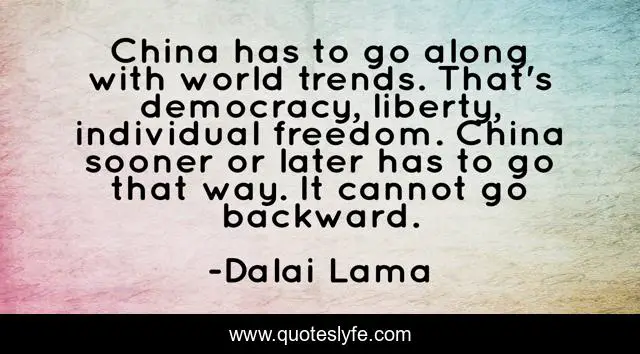 This page presents the quote "China has to go along with world trends. That's democracy, liberty, individual freedom. China sooner or later has to go that way. It cannot go backward.". Author of this quote is Dalai Lama. This quote is about world, democracy, liberty,.