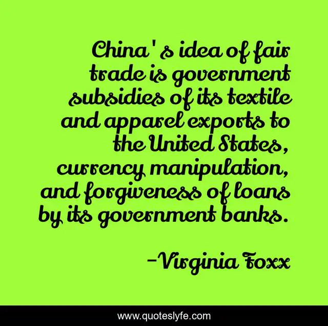 This page presents the quote "China's idea of fair trade is government subsidies of its textile and apparel exports to the United States, currency manipulation, and forgiveness of loans by its government banks.". Author of this quote is Virginia Foxx. This quote is about idea, government,.