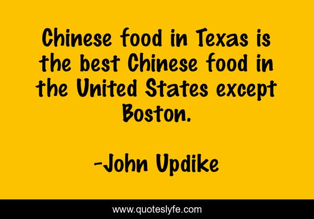 This page presents the quote "Chinese food in Texas is the best Chinese food in the United States except Boston.". Author of this quote is John Updike. This quote is about chinese-food, foodie, food, boston, culture, new-england,.