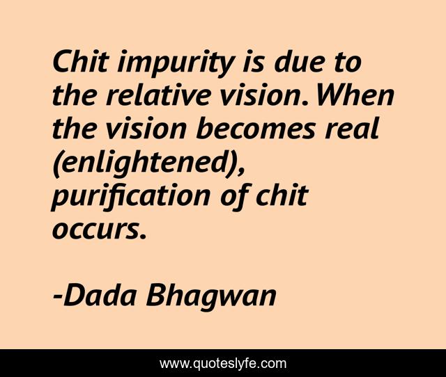 This page presents the quote "Chit impurity is due to the relative vision. When the vision becomes real (enlightened), purification of chit occurs.". Author of this quote is Dada Bhagwan. This quote is about spiritual, self, soul, the-self, the-soul, enlightened, enlightenment,.