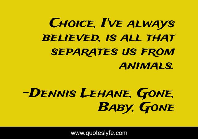 This page presents the quote "Choice, I've always believed, is all that separates us from animals.". Author of this quote is Dennis Lehane, Gone, Baby, Gone. This quote is about gone-baby-gone, choice,.