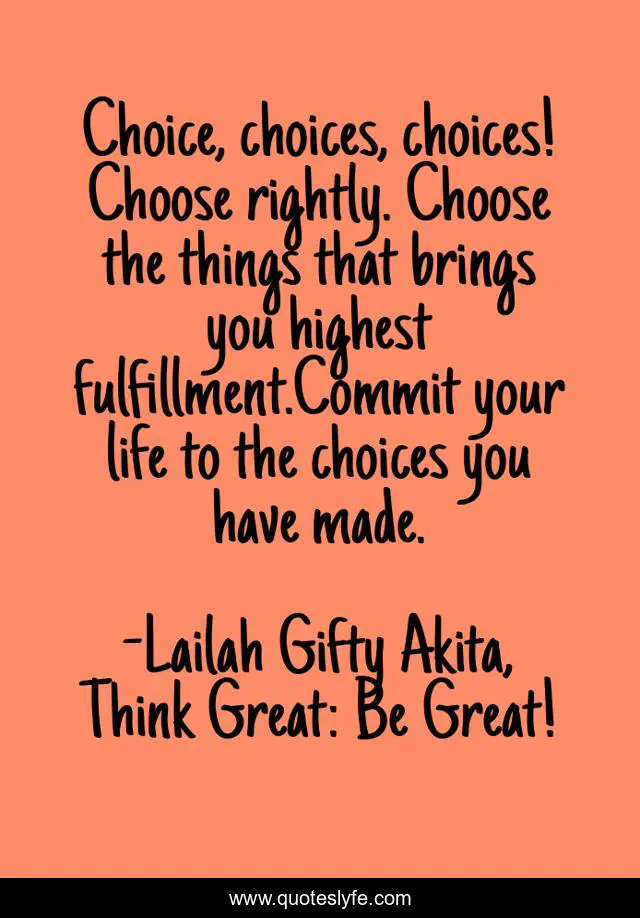 "Lailah Gifty Akita, Think Great: Be Great! Quotes." Quoteslyfe.com, 2025. Mon. 08 Dec. 2025. <https://www.quoteslyfe.com/quote/Choice-choices-choices-Choose-rightly-Choose-the-250184>.