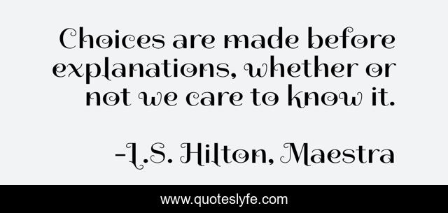 This page presents the quote "Choices are made before explanations, whether or not we care to know it.". Author of this quote is L.S. Hilton, Maestra. .