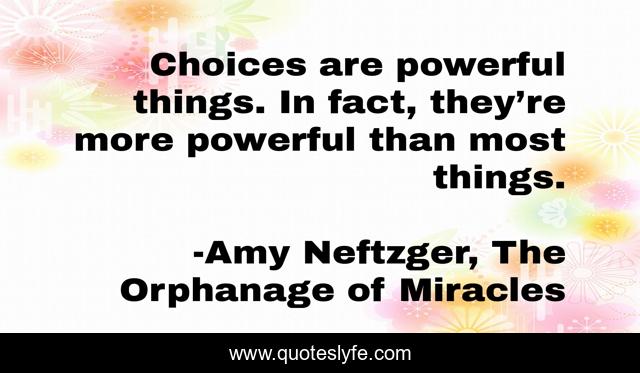 "Amy Neftzger, The Orphanage of Miracles Quotes." Quoteslyfe.com, 2025. Fri. 05 Dec. 2025. <https://www.quoteslyfe.com/quote/Choices-are-powerful-things-In-fact-they-107694>.