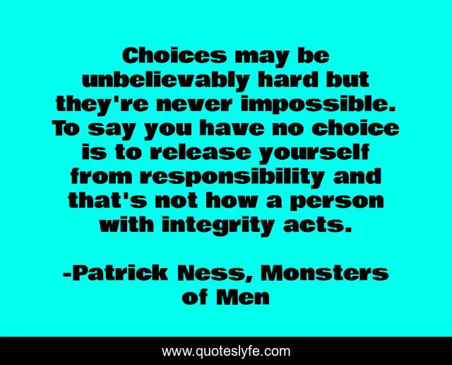 This page presents the quote "Choices may be unbelievably hard but they're never impossible. To say you have no choice is to release yourself from responsibility and that's not how a person with integrity acts.". Author of this quote is Patrick Ness, Monsters of Men. This quote is about bradley, responsibility, choice,.
