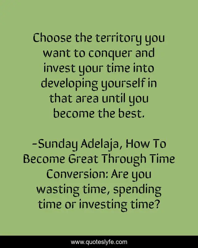 This page presents the quote "Choose the territory you want to conquer and invest your time into developing yourself in that area until you become the best.". Author of this quote is Sunday Adelaja, How To Become Great Through Time Conversion: Are you wasting time, spending time or investing time?. This quote is about life, develop-yourself, investment, conversion, productivity, wealth, area-of-calling, time-investment, greatness,.