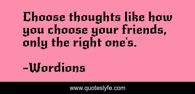 This page presents the quote "Choose thoughts like how you choose your friends, only the right one's.". Author of this quote is Wordions. This quote is about wordions-com, choose-thoughts, thoughts, wordions,.