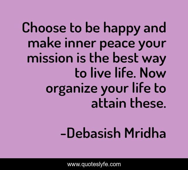 This page presents the quote "Choose to be happy and make inner peace your mission is the best way to live life. Now organize your life to attain these.". Author of this quote is Debasish Mridha. This quote is about peace, choose-to-be-happy, philosophy, debasish-mridha, quotes, organize-your-life, debasish-mridha-md, inspirational, enthusiasm,.