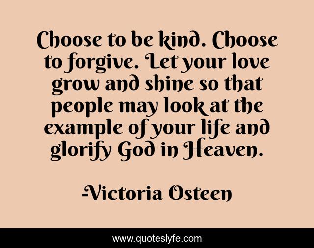 This page presents the quote "Choose to be kind. Choose to forgive. Let your love grow and shine so that people may look at the example of your life and glorify God in Heaven.". Author of this quote is Victoria Osteen. This quote is about god, life, be kind,.