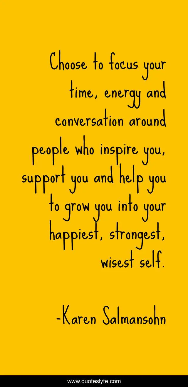 This page presents the quote "Choose to focus your time, energy and conversation around people who inspire you, support you and help you to grow you into your happiest, strongest, wisest self.". Author of this quote is Karen Salmansohn. This quote is about support, focus, self,.