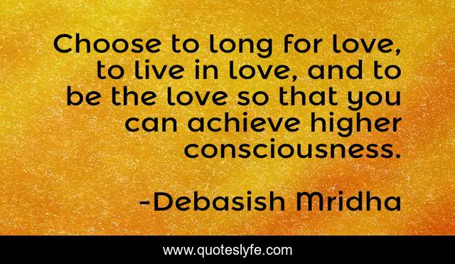 This page presents the quote "Choose to long for love, to live in love, and to be the love so that you can achieve higher consciousness.". Author of this quote is Debasish Mridha. This quote is about live-in-love, love, consciousness, philosophy, debasish-mridha, quotes, inspirational, long-for-love, enthusiasm,.