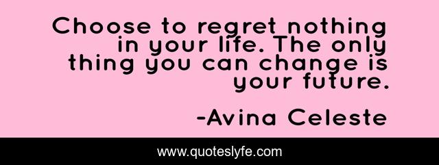 This page presents the quote "Choose to regret nothing in your life. The only thing you can change is your future.". Author of this quote is Avina Celeste. This quote is about life, regret, positive, motivational, confidence, choice, optimistic, inspirational, enthusiasm,.