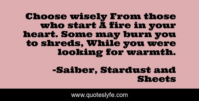 This page presents the quote "Choose wisely From those who start A fire in your heart. Some may burn you to shreds, While you were looking for warmth.". Author of this quote is Saiber, Stardust and Sheets. This quote is about heartache, heart, love, poem, fire, tragic-romance, poetry, romance, heartbreak,.
