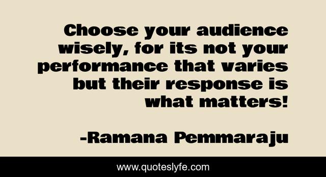 This page presents the quote "Choose your audience wisely, for its not your performance that varies but their response is what matters!". Author of this quote is Ramana Pemmaraju. This quote is about personal-development, audience, caution-in-what-you-say, stages-of-life,.