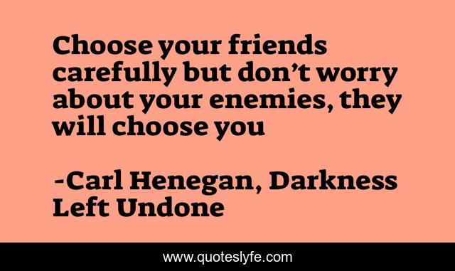 This page presents the quote "Choose your friends carefully but don’t worry about your enemies, they will choose you". Author of this quote is Carl Henegan, Darkness Left Undone. .