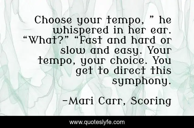 This page presents the quote "Choose your tempo, ” he whispered in her ear. “What?” “Fast and hard or slow and easy. Your tempo, your choice. You get to direct this symphony.". Author of this quote is Mari Carr, Scoring. This quote is about scoring, erotica, mari-carr,.