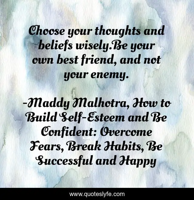 This page presents the quote "Choose your thoughts and beliefs wisely.Be your own best friend, and not your enemy.". Author of this quote is Maddy Malhotra, How to Build Self-Esteem and Be Confident: Overcome Fears, Break Habits, Be Successful and Happy. This quote is about mindset, happy-life, successful-living, self-control, positive-thinking,.