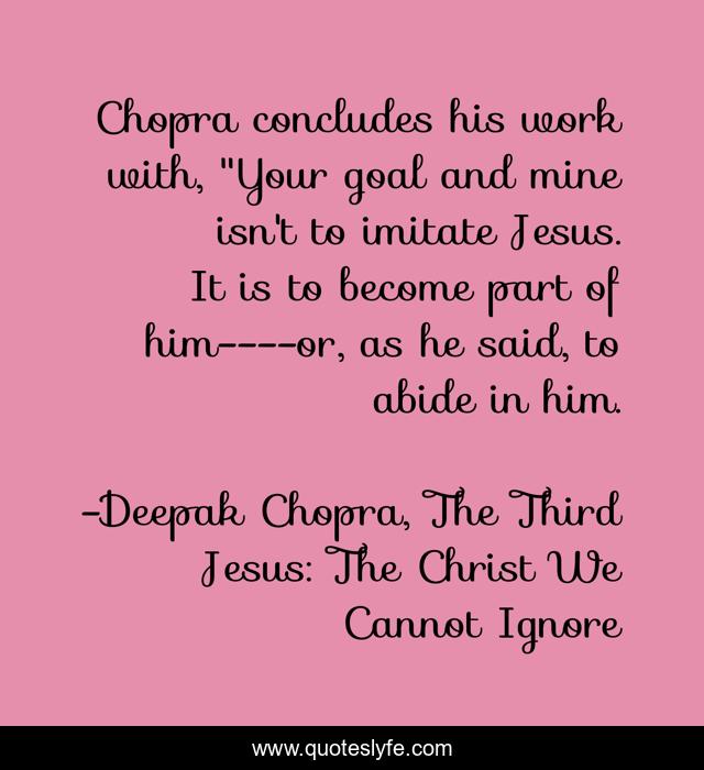 This page presents the quote "Chopra concludes his work with, "Your goal and mine isn't to imitate Jesus. It is to become part of him----or, as he said, to abide in him.". Author of this quote is Deepak Chopra, The Third Jesus: The Christ We Cannot Ignore. This quote is about spirituality, christianity,.
