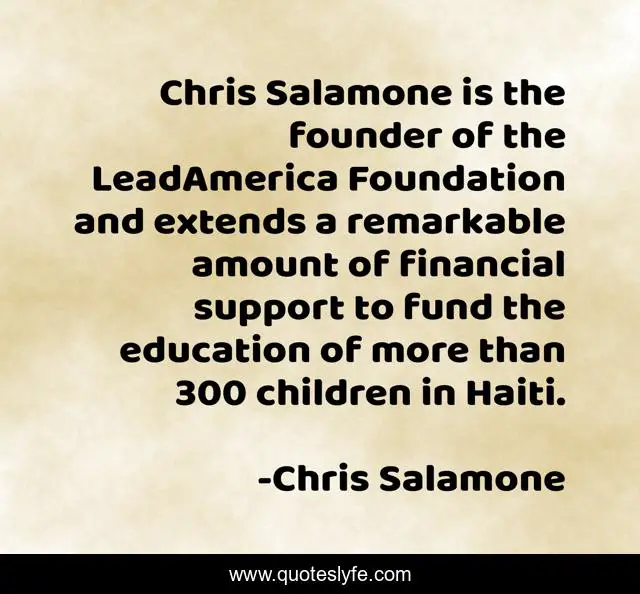 This page presents the quote "Chris Salamone is the founder of the LeadAmerica Foundation and extends a remarkable amount of financial support to fund the education of more than 300 children in Haiti.". Author of this quote is Chris Salamone. This quote is about chris-salamone-boca-raton, author,.