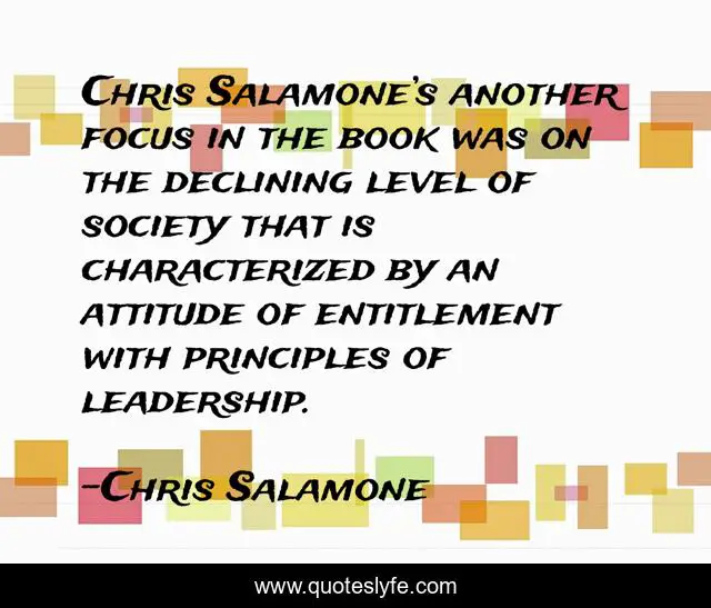 This page presents the quote "Chris Salamone’s another focus in the book was on the declining level of society that is characterized by an attitude of entitlement with principles of leadership.". Author of this quote is Chris Salamone. This quote is about chris-salamone-boca-raton, author,.