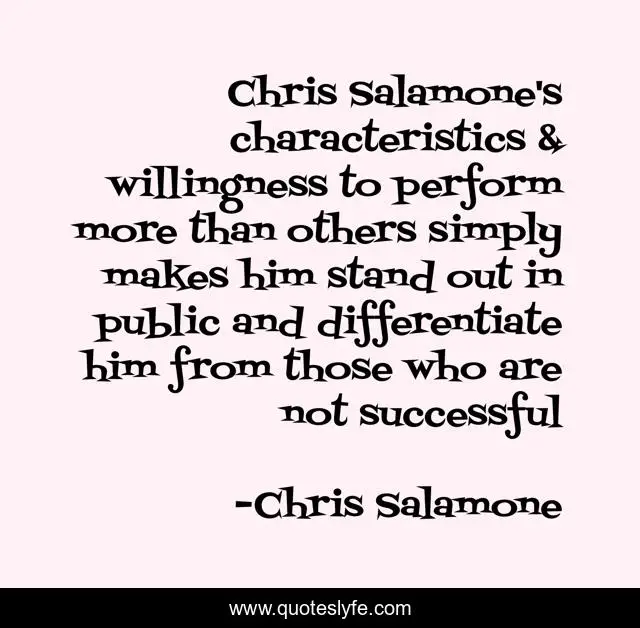 This page presents the quote "Chris Salamone's characteristics & willingness to perform more than others simply makes him stand out in public and differentiate him from those who are not successful". Author of this quote is Chris Salamone. This quote is about chris-salamone-boca-raton, entrepreneur, chris-salamone, author,.