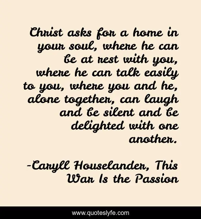 This page presents the quote "Christ asks for a home in your soul, where he can be at rest with you, where he can talk easily to you, where you and he, alone together, can laugh and be silent and be delighted with one another.". Author of this quote is Caryll Houselander, This War Is the Passion. This quote is about home, author, christ, soul, catholic,.