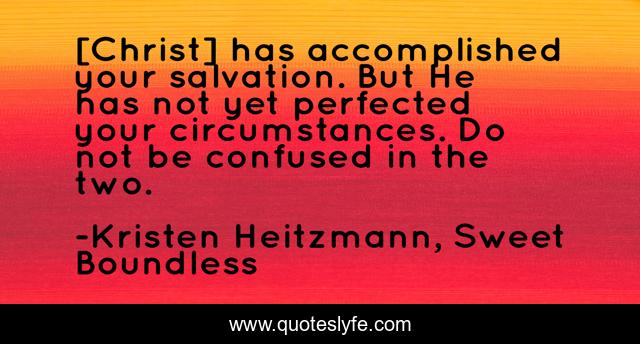 This page presents the quote "[Christ] has accomplished your salvation. But He has not yet perfected your circumstances. Do not be confused in the two.". Author of this quote is Kristen Heitzmann, Sweet Boundless. This quote is about christian, trials, inspirational, enthusiasm, salvation, circumstances,.