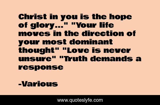 This page presents the quote "Christ in you is the hope of glory..." "Your life moves in the direction of your most dominant thought" "Love is never unsure" "Truth demands a response". Author of this quote is Various. .