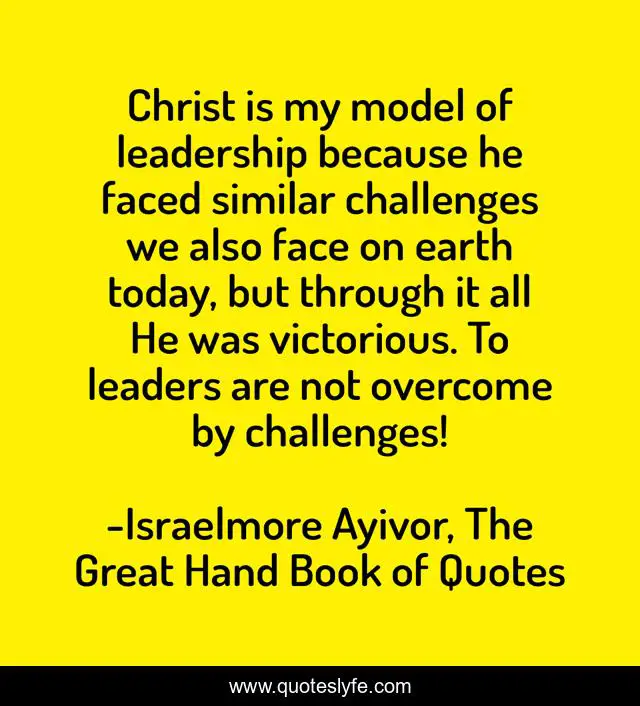 This page presents the quote "Christ is my model of leadership because he faced similar challenges we also face on earth today, but through it all He was victorious. To leaders are not overcome by challenges!". Author of this quote is Israelmore Ayivor, The Great Hand Book of Quotes. This quote is about leaders, overcomers, jesus, challenges, earth, food-for-thought, take-the-lead, christ, lead,.