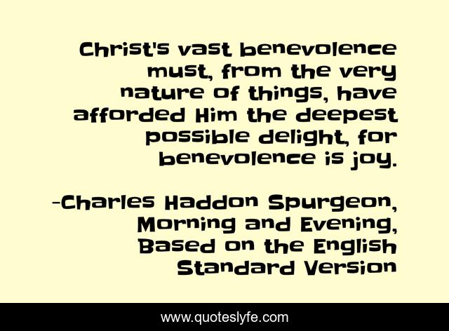 This page presents the quote "Christ's vast benevolence must, from the very nature of things, have afforded Him the deepest possible delight, for benevolence is joy.". Author of this quote is Charles Haddon Spurgeon, Morning and Evening, Based on the English Standard Version. This quote is about graciousness, resilience, community,.