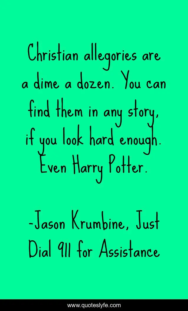 This page presents the quote "Christian allegories are a dime a dozen. You can find them in any story, if you look hard enough. Even Harry Potter.". Author of this quote is Jason Krumbine, Just Dial 911 for Assistance. This quote is about christian-allegories, harry-potter,.