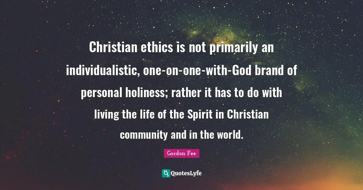 This page presents the quote "Christian ethics is not primarily an individualistic, one-on-one-with-God brand of personal holiness; rather it has to do with living the life of the Spirit in Christian community and in the world.". Author of this quote is Gordon Fee. This quote is about life, holiness, live life, ethics, community, christian community, god, christian, individualistic,.