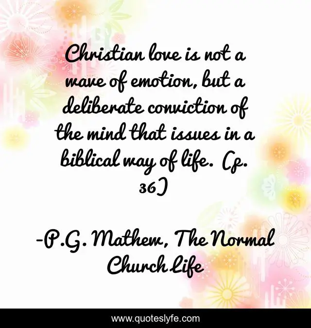 This page presents the quote "Christian love is not a wave of emotion, but a deliberate conviction of the mind that issues in a biblical way of life. (p. 36)". Author of this quote is P.G. Mathew, The Normal Church Life. .
