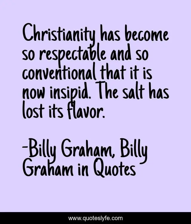 This page presents the quote "Christianity has become so respectable and so conventional that it is now insipid. The salt has lost its flavor.". Author of this quote is Billy Graham, Billy Graham in Quotes. This quote is about billy-graham, christianity,.