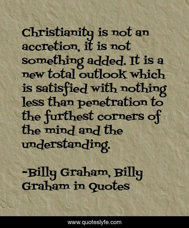 This page presents the quote "Christianity is not an accretion, it is not something added. It is a new total outlook which is satisfied with nothing less than penetration to the furthest corners of the mind and the understanding.". Author of this quote is Billy Graham, Billy Graham in Quotes. This quote is about billy-graham, christianity,.