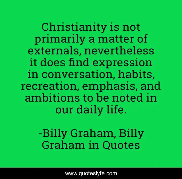 This page presents the quote "Christianity is not primarily a matter of externals, nevertheless it does find expression in conversation, habits, recreation, emphasis, and ambitions to be noted in our daily life.". Author of this quote is Billy Graham, Billy Graham in Quotes. This quote is about billy-graham, christianity,.