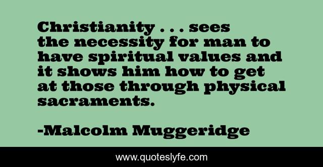 This page presents the quote "Christianity . . . sees the necessity for man to have spiritual values and it shows him how to get at those through physical sacraments.". Author of this quote is Malcolm Muggeridge. This quote is about spiritual, belief, life, christianity, inspirational, enthusiasm,.