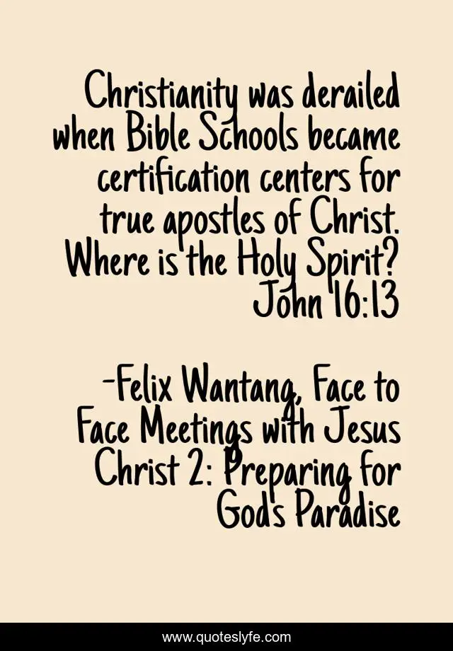This page presents the quote "Christianity was derailed when Bible Schools became certification centers for true apostles of Christ. Where is the Holy Spirit? John 16:13". Author of this quote is Felix Wantang, Face to Face Meetings with Jesus Christ 2: Preparing for God's Paradise. This quote is about jesus-christ, heaven, holy, certification, god, christianity, apostles, holy-spirity,.