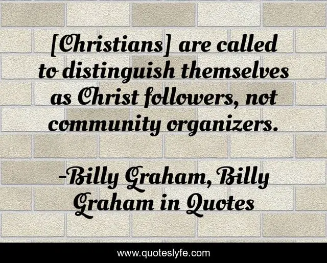This page presents the quote "[Christians] are called to distinguish themselves as Christ followers, not community organizers.". Author of this quote is Billy Graham, Billy Graham in Quotes. This quote is about followers, billy-graham,.
