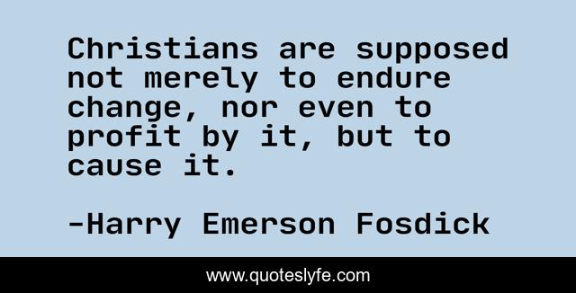 This page presents the quote "Christians are supposed not merely to endure change, nor even to profit by it, but to cause it.". Author of this quote is Harry Emerson Fosdick. This quote is about profit, endure, christians,.