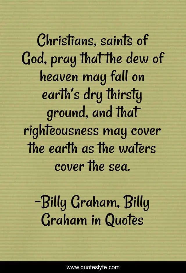 This page presents the quote "Christians, saints of God, pray that the dew of heaven may fall on earth’s dry thirsty ground, and that righteousness may cover the earth as the waters cover the sea.". Author of this quote is Billy Graham, Billy Graham in Quotes. This quote is about billy-graham, christianity,.