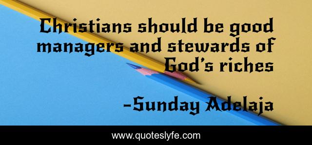 This page presents the quote "Christians should be good managers and stewards of God’s riches". Author of this quote is Sunday Adelaja. This quote is about prosperity, good, wealth, god, riches, manager, stewards, money, truth-of-life,.
