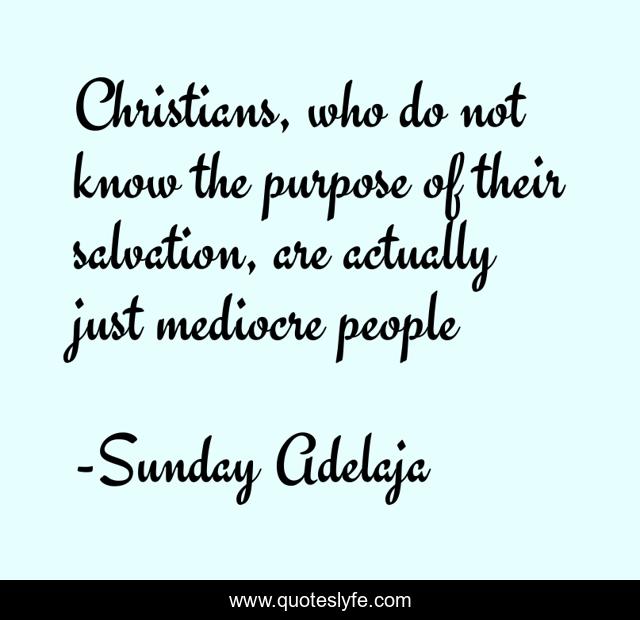 This page presents the quote "Christians, who do not know the purpose of their salvation, are actually just mediocre people". Author of this quote is Sunday Adelaja. This quote is about mediocre, salvation, purpose, christians, people,.