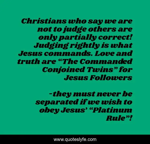 This page presents the quote "Christians who say we are not to judge others are only partially correct! Judging rightly is what Jesus commands. Love and truth are “The Commanded Conjoined Twins” for Jesus Followers". Author of this quote is they must never be separated if we wish to obey Jesus’ “Platinum Rule”!. .