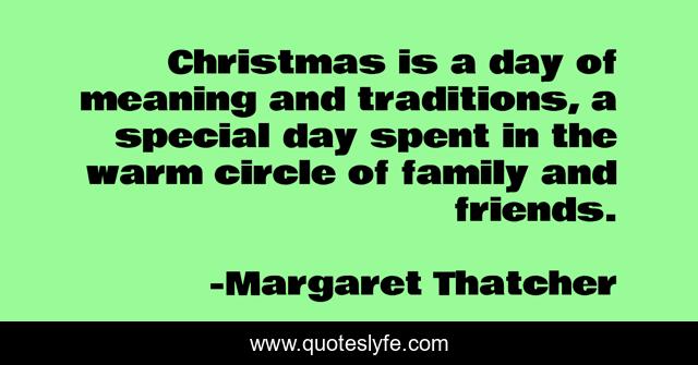 This page presents the quote "Christmas is a day of meaning and traditions, a special day spent in the warm circle of family and friends.". Author of this quote is Margaret Thatcher. .