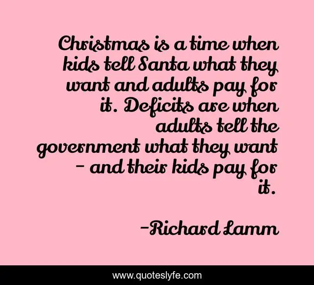 This page presents the quote "Christmas is a time when kids tell Santa what they want and adults pay for it. Deficits are when adults tell the government what they want - and their kids pay for it.". Author of this quote is Richard Lamm. This quote is about time, government,.