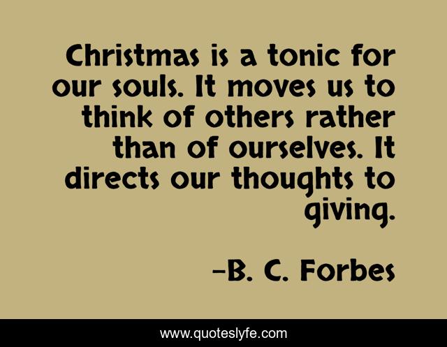 This page presents the quote "Christmas is a tonic for our souls. It moves us to think of others rather than of ourselves. It directs our thoughts to giving.". Author of this quote is B. C. Forbes. This quote is about giving, think, thoughts,.