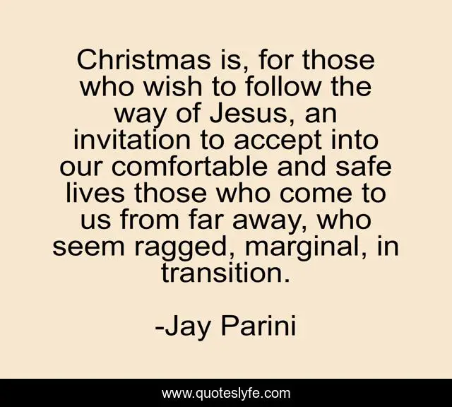 This page presents the quote "Christmas is, for those who wish to follow the way of Jesus, an invitation to accept into our comfortable and safe lives those who come to us from far away, who seem ragged, marginal, in transition.". Author of this quote is Jay Parini. This quote is about wish, transition, far away,.