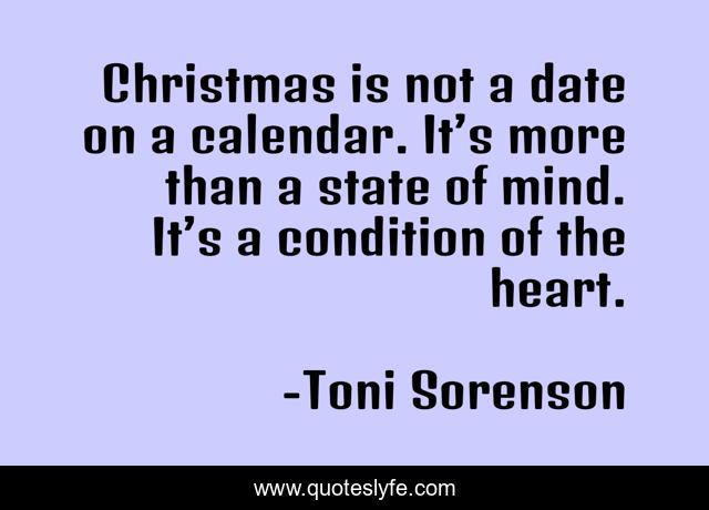 This page presents the quote "Christmas is not a date on a calendar. It’s more than a state of mind. It’s a condition of the heart.". Author of this quote is Toni Sorenson. This quote is about christmas-spirit, christmas, holidays,.
