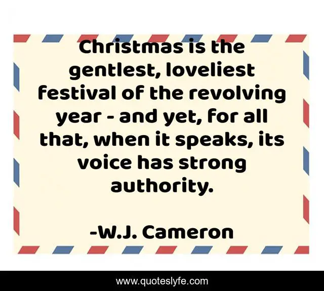 This page presents the quote "Christmas is the gentlest, loveliest festival of the revolving year - and yet, for all that, when it speaks, its voice has strong authority.". Author of this quote is W.J. Cameron. .